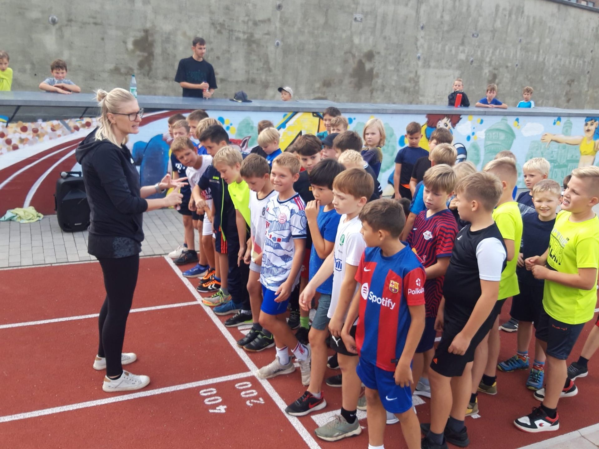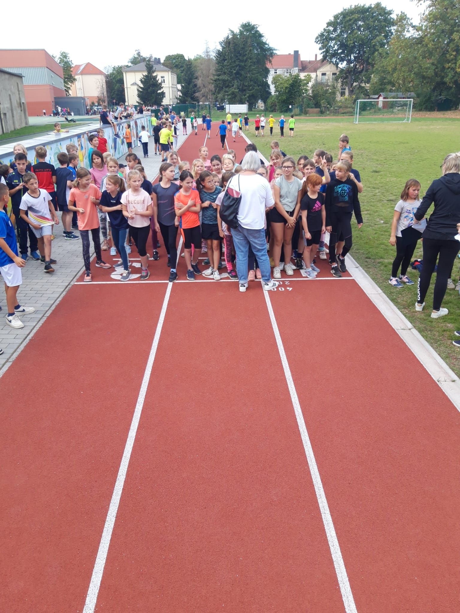 Am Freitag, den 29.09.2023, hat es das Wetter gut mit uns gemeint. Bei angenehm warmen Temperaturen konnten sich unsere Kinder am traditionellen Lauf vor den Herbstferien beteiligen. Bevor die Läufe starteten, hatten die Kinder der Klasse 3a für die Erwärmung gesorgt. Aufgeregt und mit musikalischer Unterstützung zeigten sie allen, wie sie sich erwärmen können und gut auf den kommenden Lauf vorbereitet sind. Vielen lieben Dank an die mutigen Kinder! :)