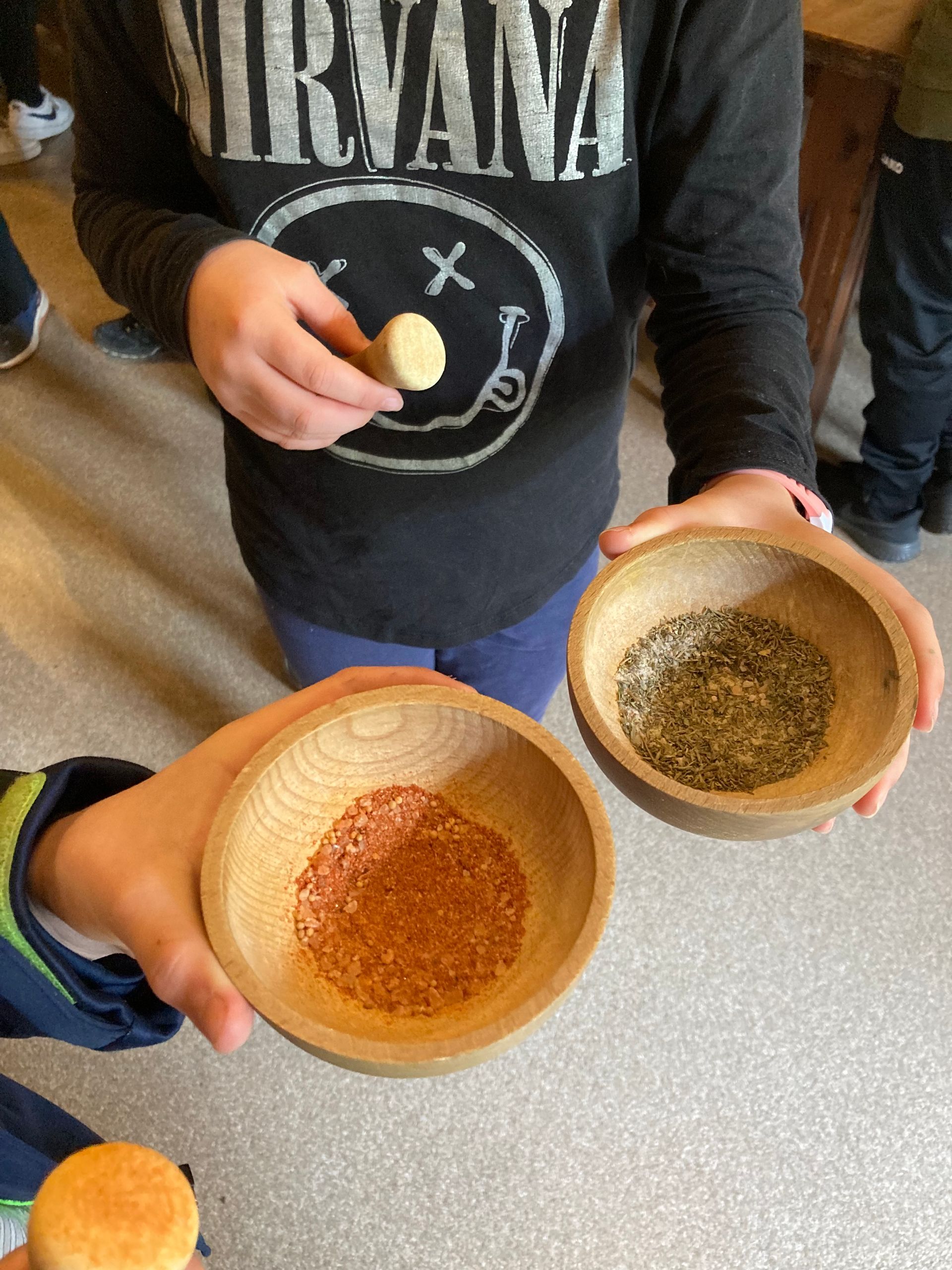 Um 7:25 Uhr sind wir aufgewacht. Nach einem leckeren Frühstück sind wir auf den Hof gegangen, wo Carl und Stella von Federwolf uns begrüßt haben. Nach dem Arbeiten im Arbeitsheft haben wir ein Gerichtsverfahren nachgespielt. Als nächstes haben wir Kerzen gezogen und Kräutersalz hergestellt. Als wir fertig waren sind wir auf den Hinterhof gegangen um Körbe zu flechten. Nach dem Körbeflechten sind wir wieder rein zum Filzen gegangen. Als unsere Filzbälle fertig waren haben wir Seife hergestellt. Es gab verschiedene Gerüche und Farben.
