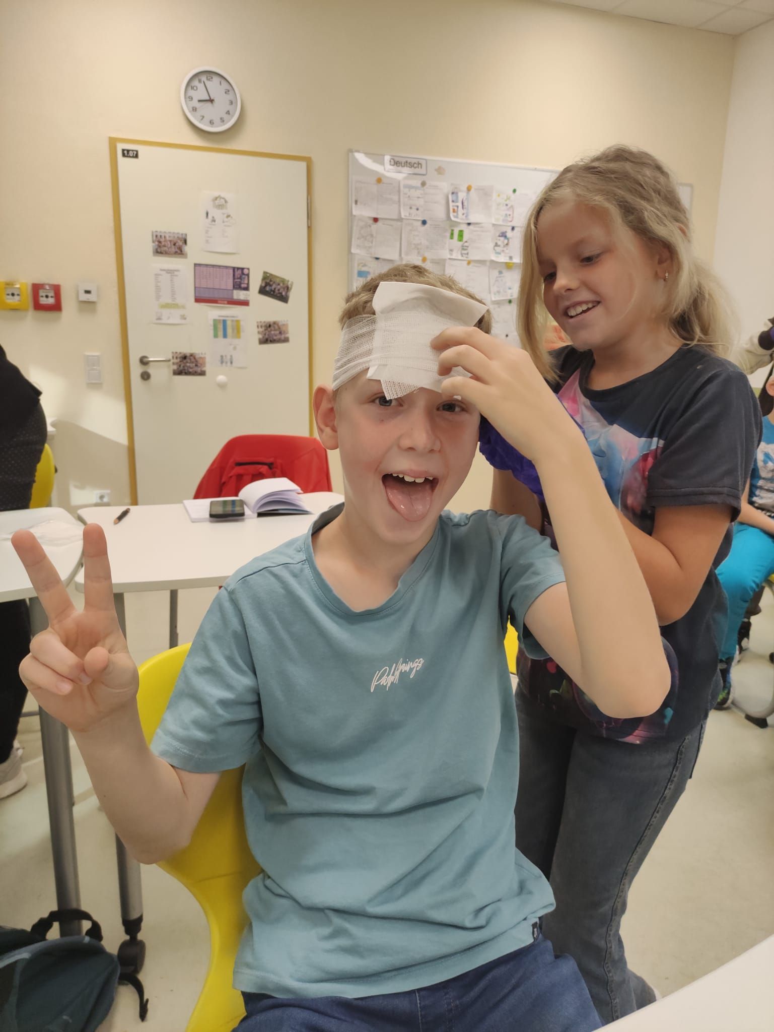 Manche Kinder sind mit lustigen Kopfverbänden in die Pause gegangen ๐๐ง .